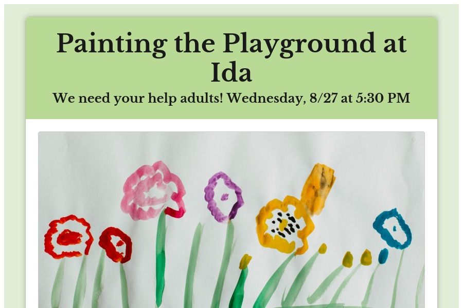 Painting the Playground at Ida We need your help adults! Wednesday, 8/27 at 5:30 PM Welcome families Painting Jobs - any help is appreciated! . . .